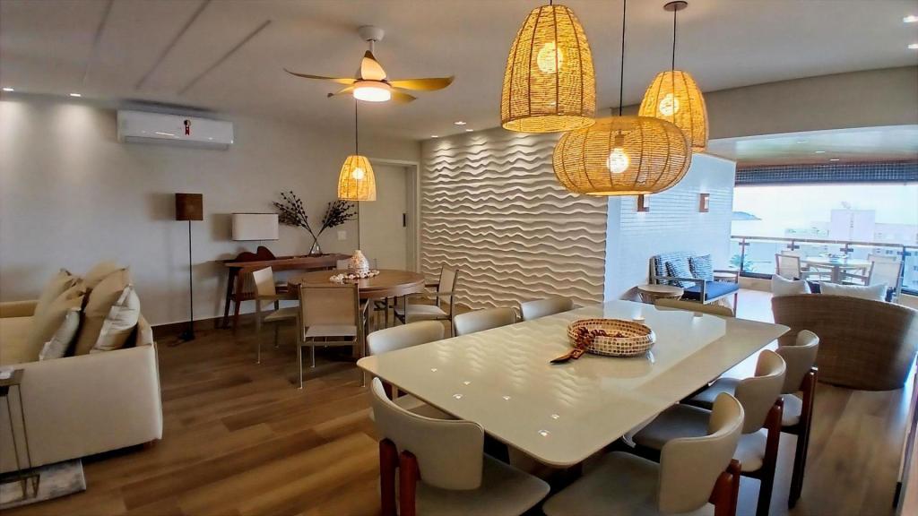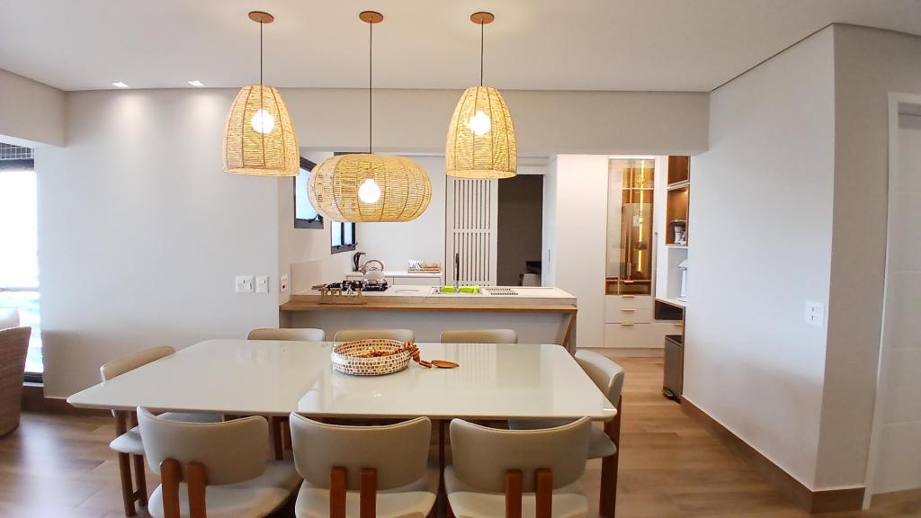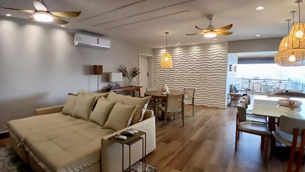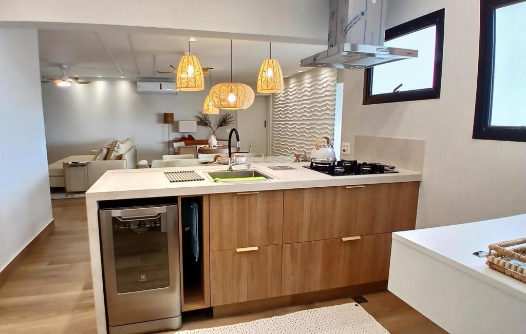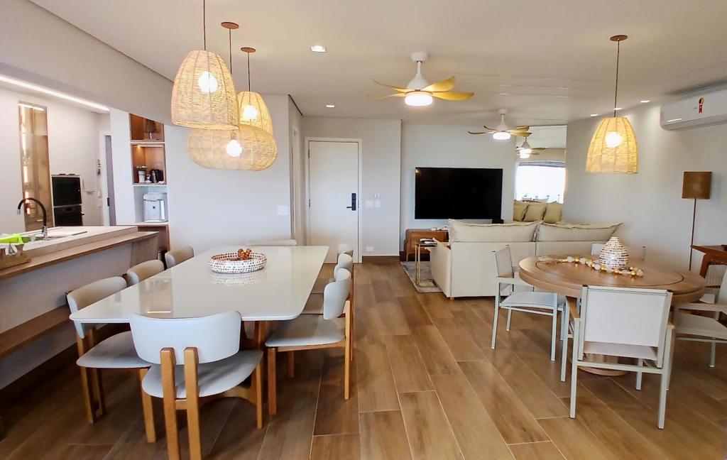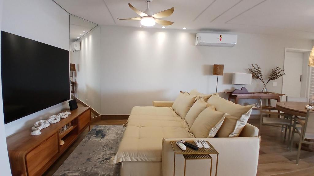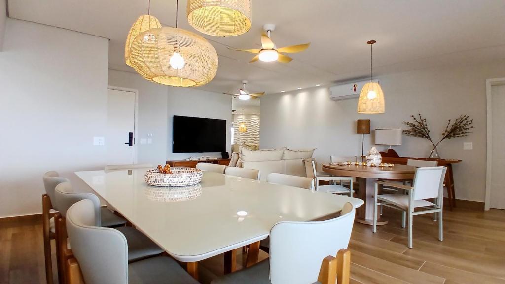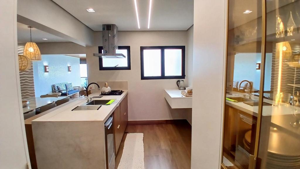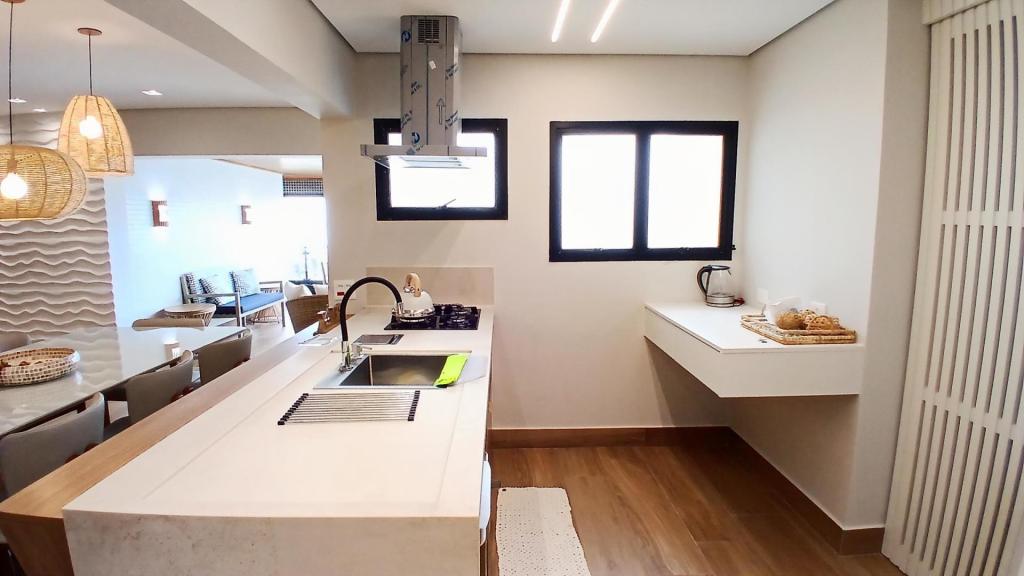 A sala ampla é integrada à cozinha americana, formando um espaço moderno, funcional e acolhedor. A sala também se conecta à varanda com fechamento em vidro, ideal para relaxar e aproveitar a vista para o mar em qualquer período do dia.
